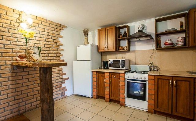 – Большая гостиная с кухней: Пространство для общения, оборудованное всей необходимой техникой и посудой. Телевизор для вечернего просмотра.