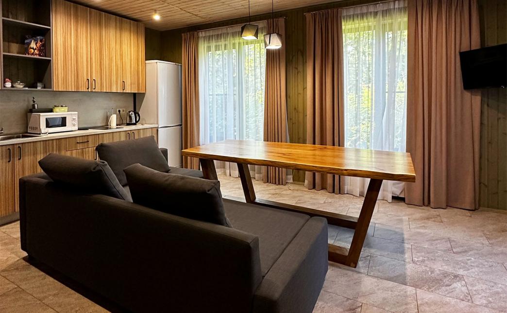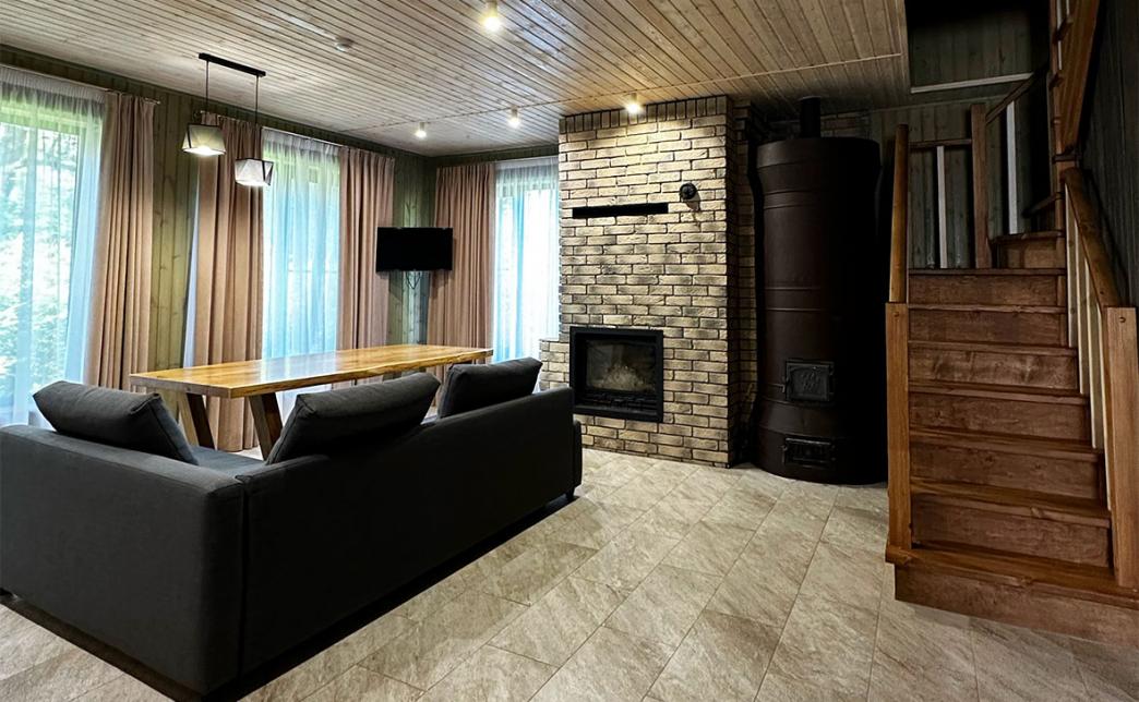 • Большой гостевой дом — идеален для компаний друзей или нескольких семей. Размещение в 16 уютных номерах с видом на лес. Доступна аквазона с сауной и бассейном (по предварительному бронированию).