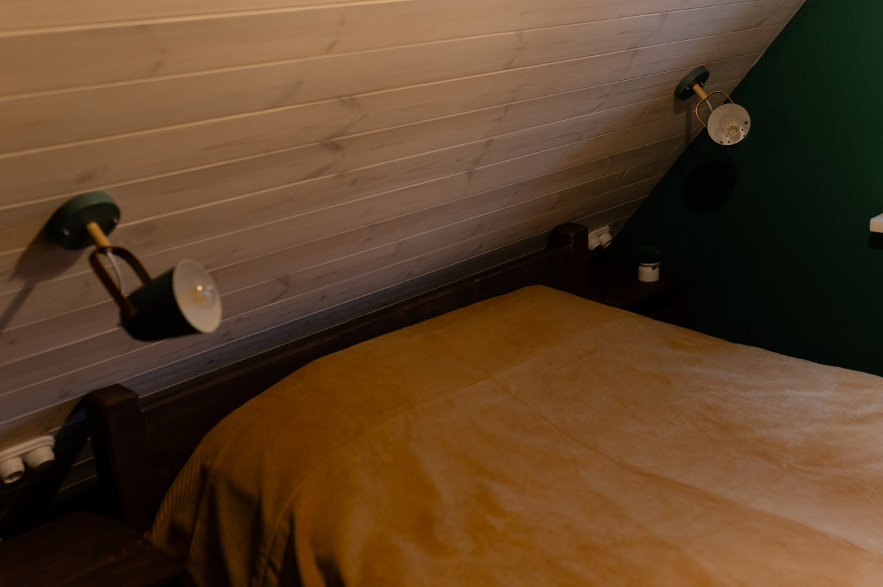 • Второй этаж: уединенная спальная зона с двуспальной кроватью и видом на гостиную. Дополнительные спальные места можно организовать в гостиной.