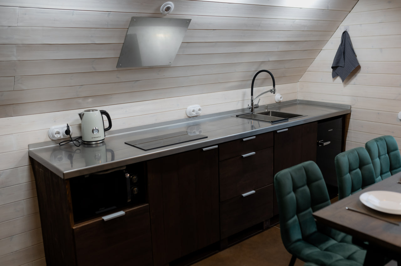 • Первый этаж — пространство для общения: Здесь находится гостиная с диваном, полноценная кухня, русская баня и выход на террасу к купели.