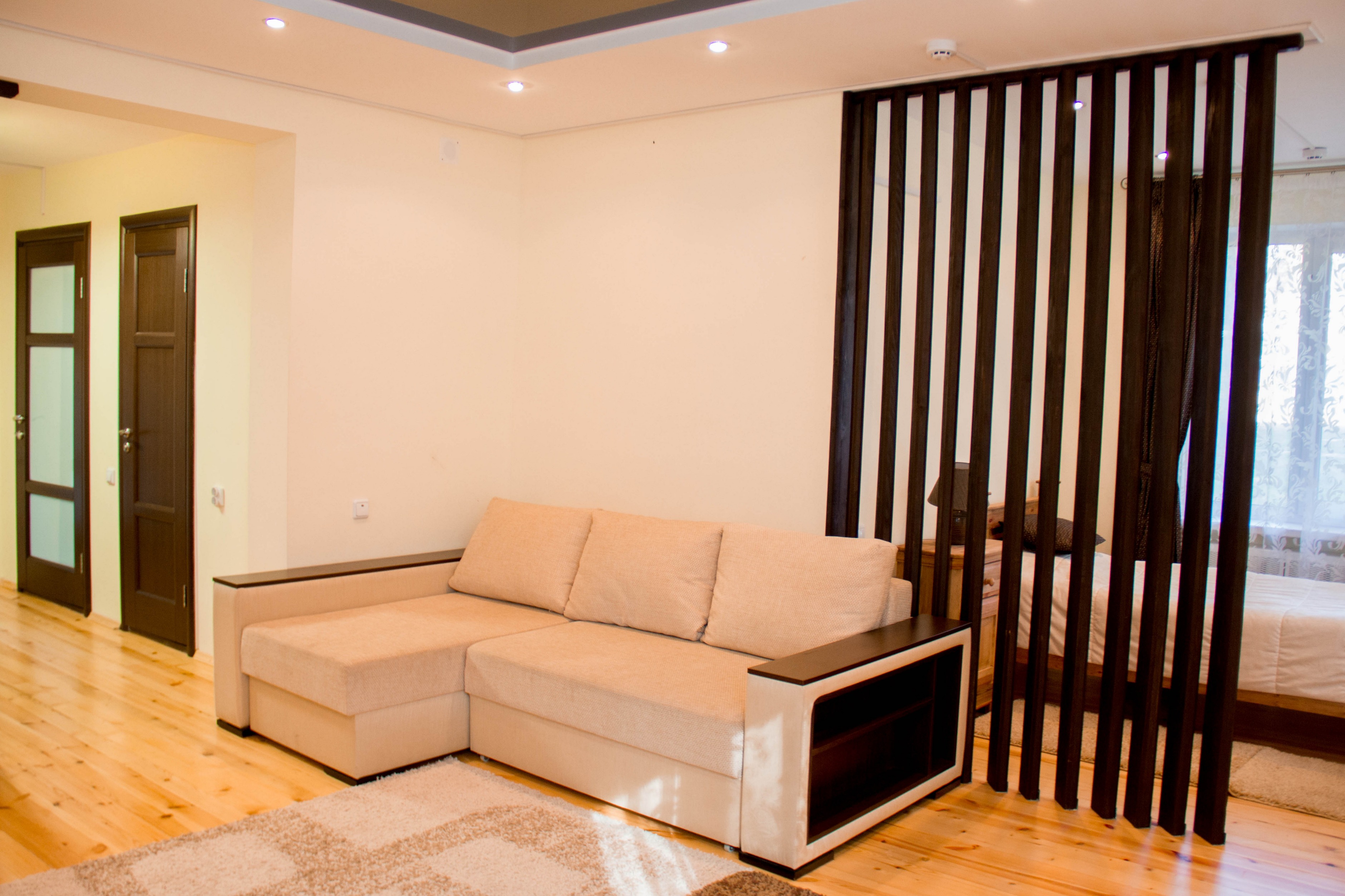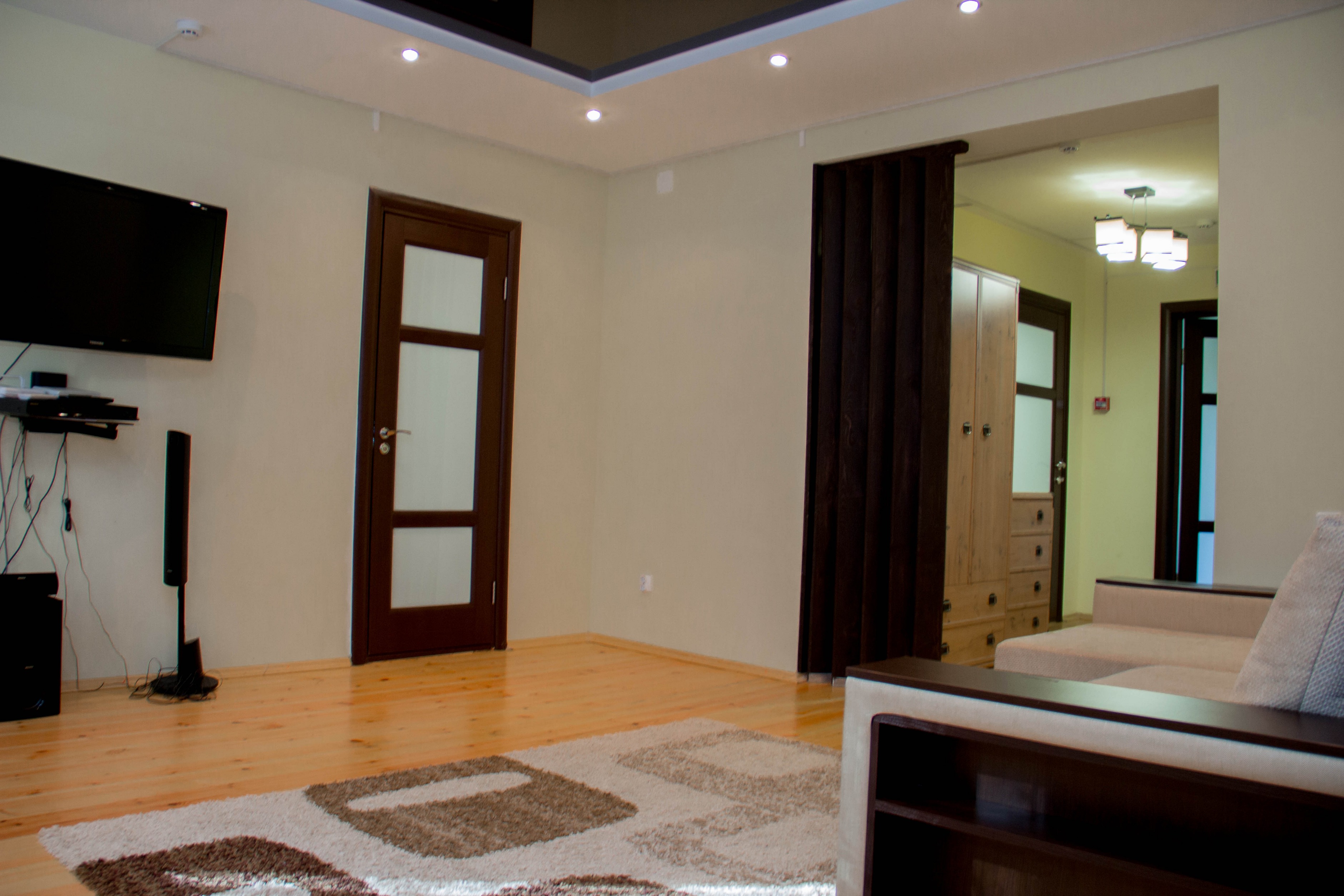 - Просторный зал с мягкой мебелью (три спальных места), телевизором с подключённым телевидением ZALA и домашним кинотеатром станет центром вечернего досуга.