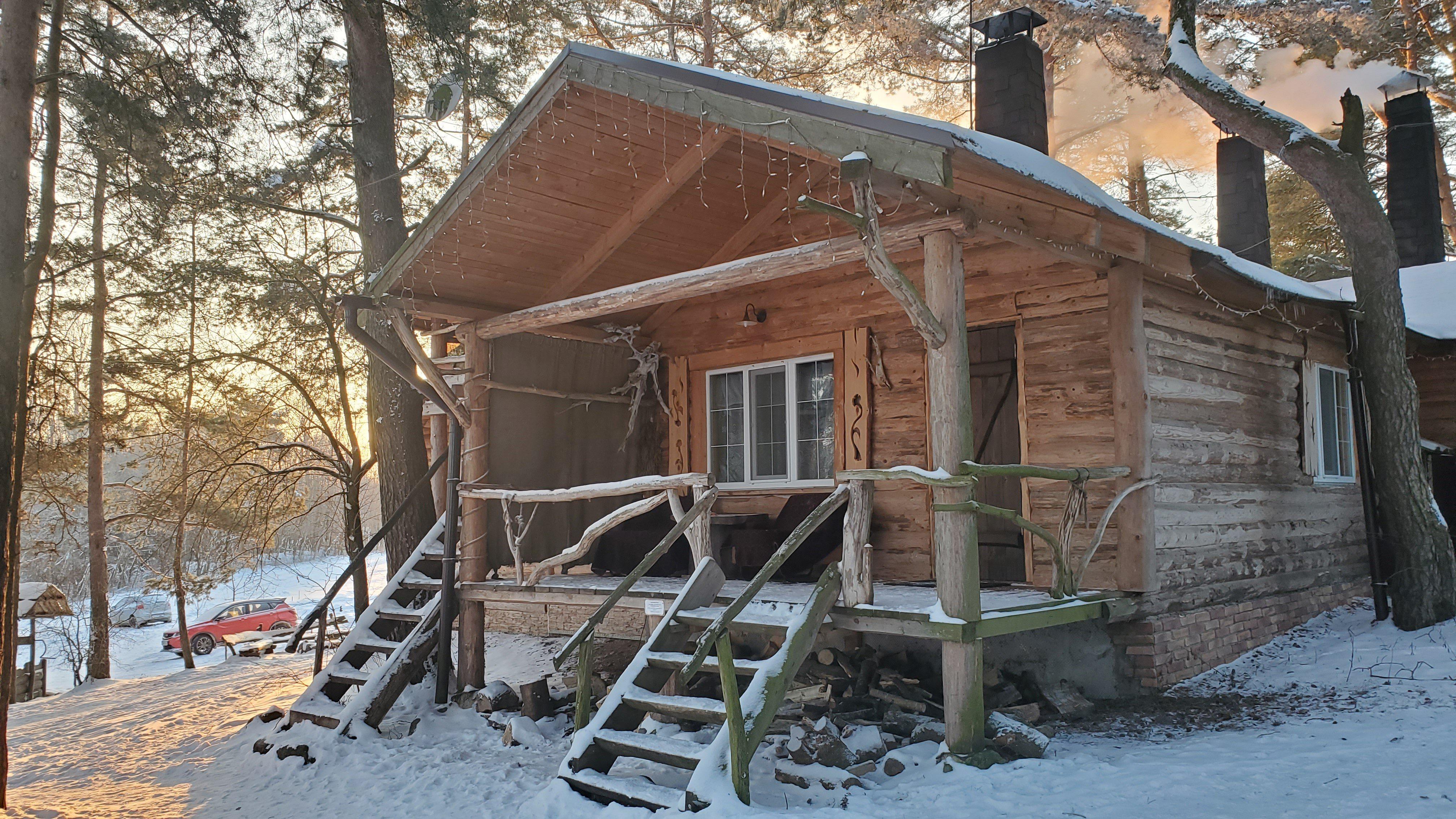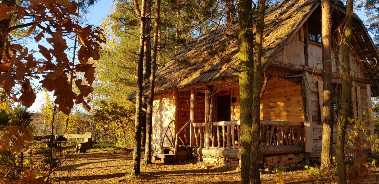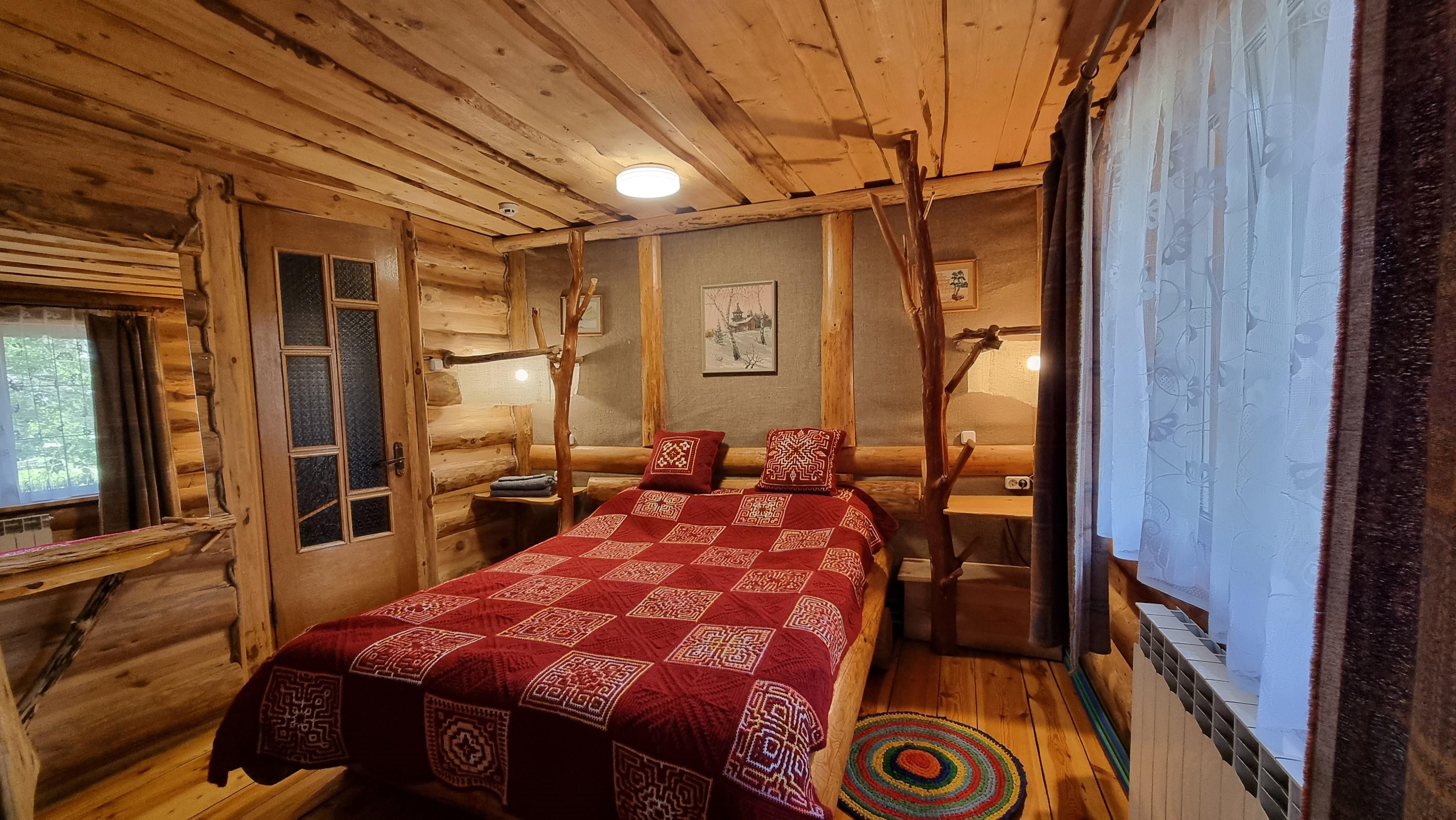 2. «Грыбнікова хата» (до 4 гостей). Отдельно стоящий бревенчатый дом с мансардой, печью-камином и уютным крыльцом. Идеален для семьи или дружной компании.