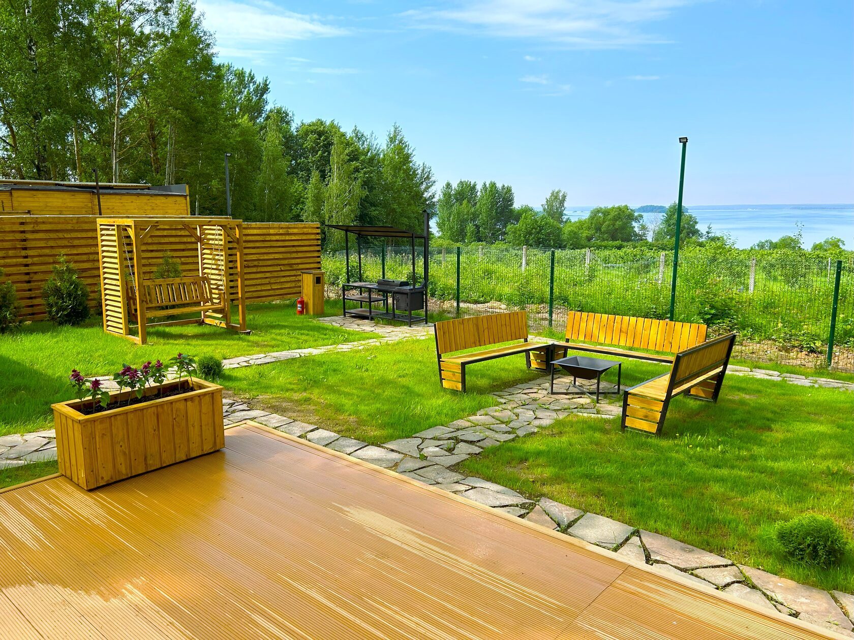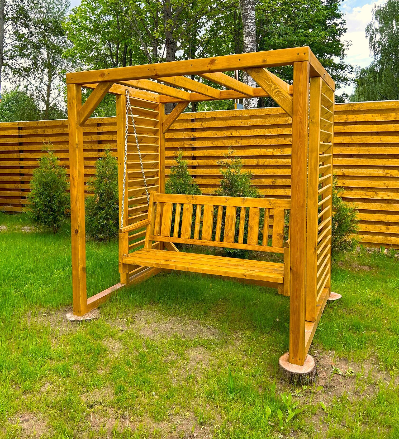 - Качели – элемент релакса и любимое место для утреннего кофе