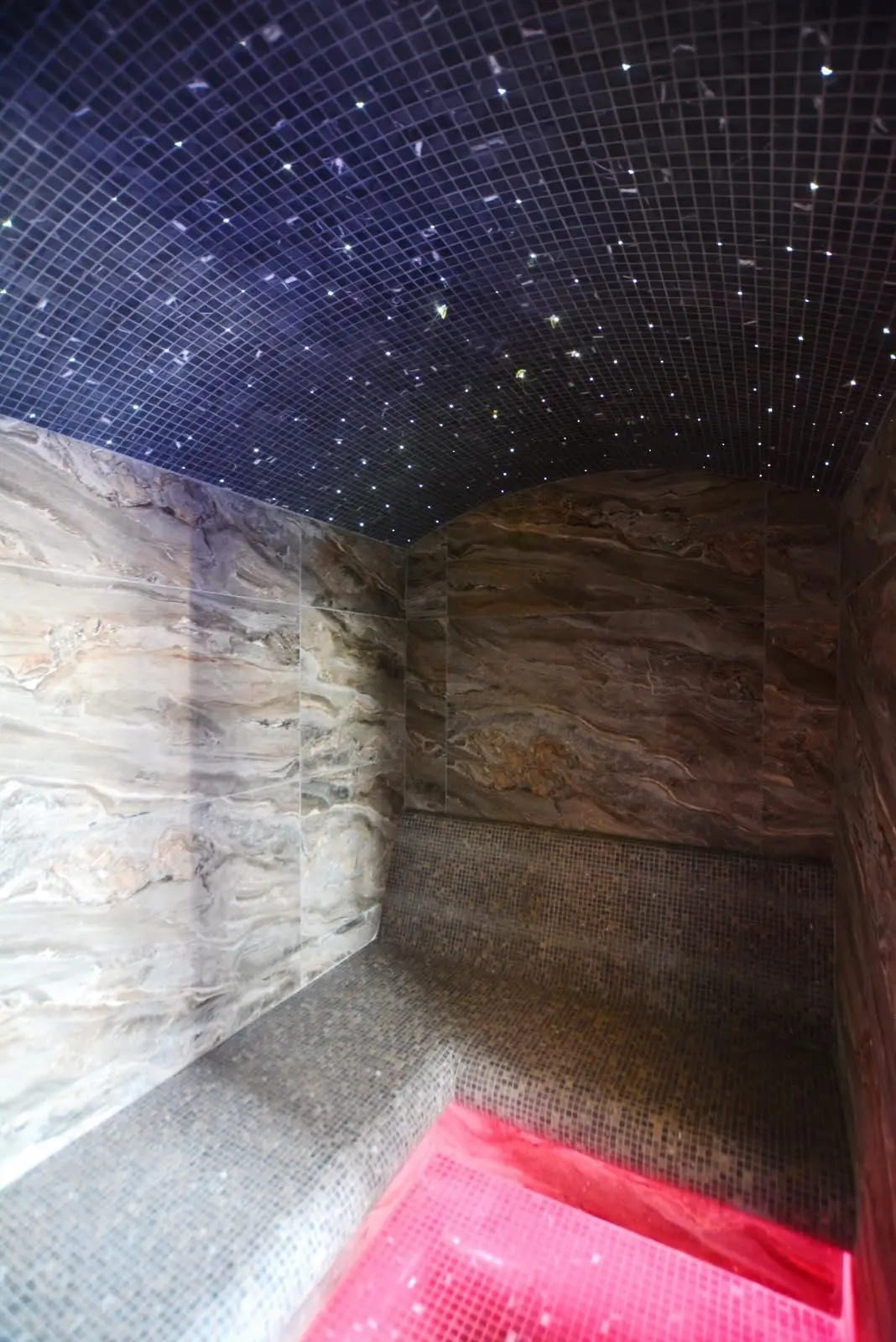 - Банный комплекс: две парные на выбор — финско-русская (с регулируемой влажностью и температурой) и турецкая (хамам, более низкая температура и сухой воздух). Для любителей русской бани на территории есть отдельный гостевой домик с русской баней.