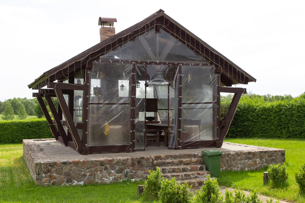 - Закрытая панорамная беседка (вместительная, с мебелью и зоной барбекю)