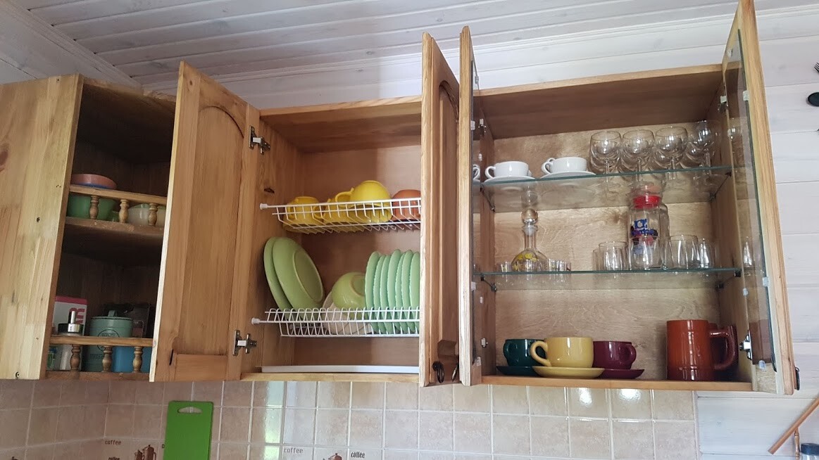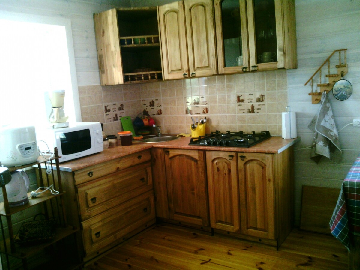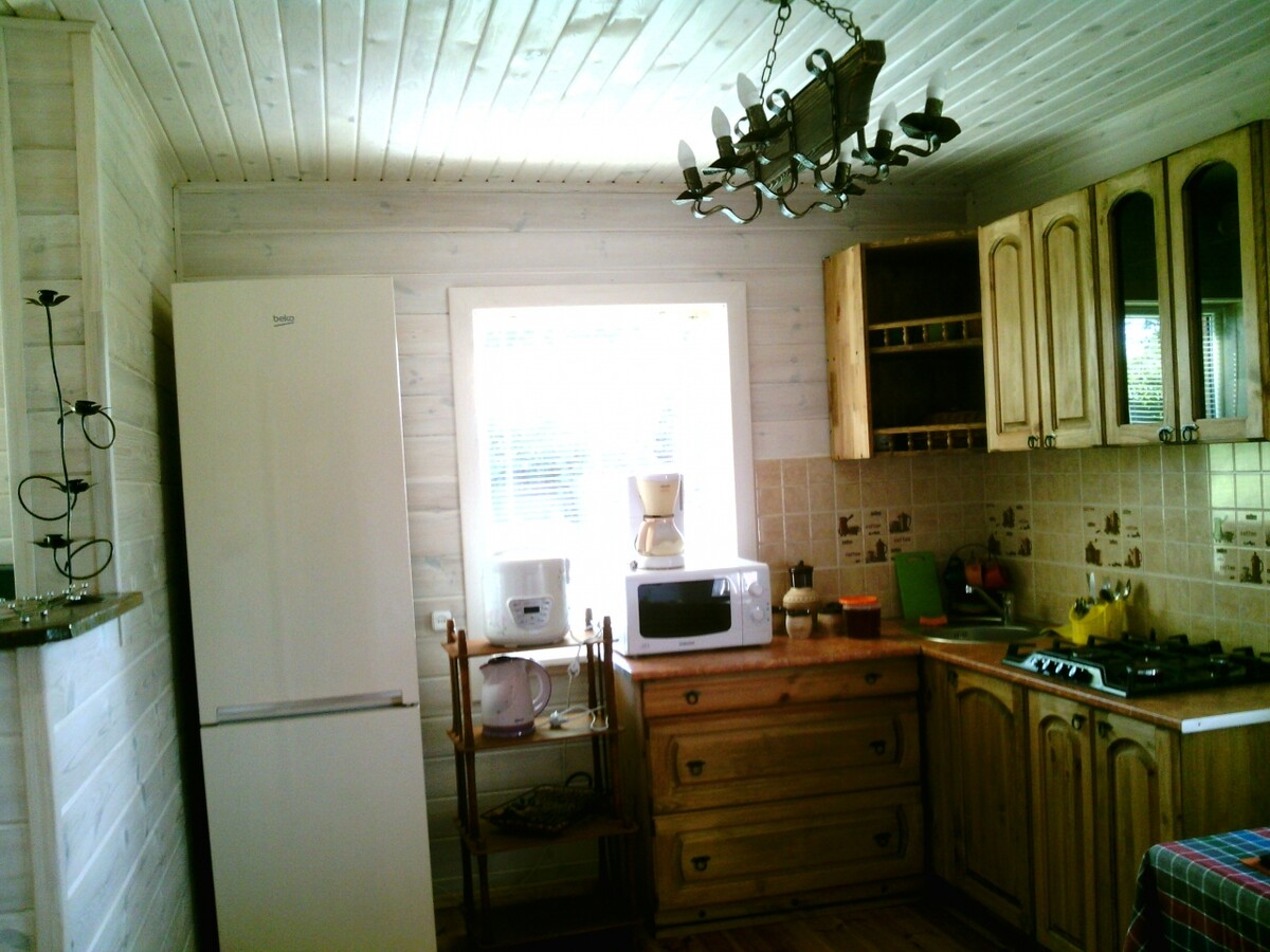 - Кухня с плитой, холодильником, микроволновкой, электрочайником, посудой